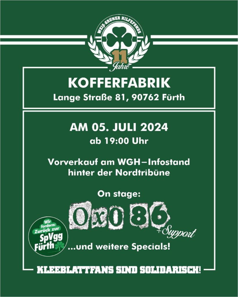 Nach unserer verschobenen 10-Jahres-Feier werden wir nun unser 11-jähriges Bestehen feiern. Aufgrund der Jahreszeit und enormen Ticketanfragen ziehen wir in die „Kofferfabrik Fürth“ um. Es wird somit ein kleines Zusatzkontingent an Tickets im Vorverkauf geben. Wer sich demnach noch eindecken muss, kann dies an den kommenden Heimspielen am Infostand des WGH hinter der Nordtribüne nachholen. Schnell sein lohnt sich! Die bereits verkauften Tickets behalten selbstverständlich ihre Gültigkeit.